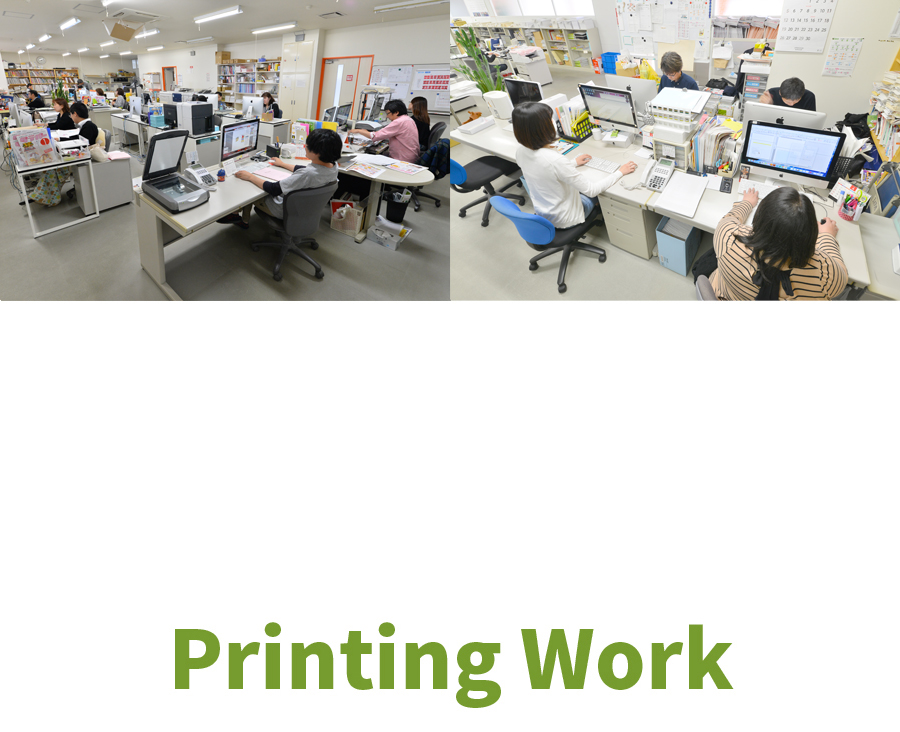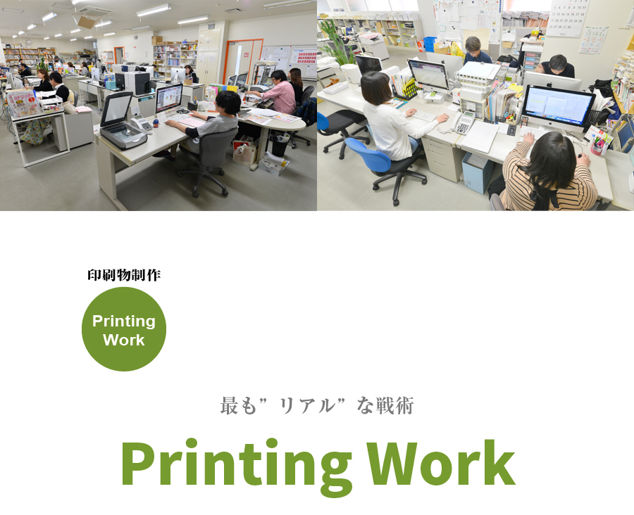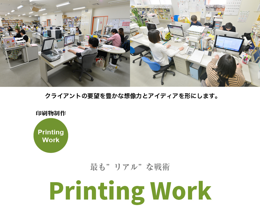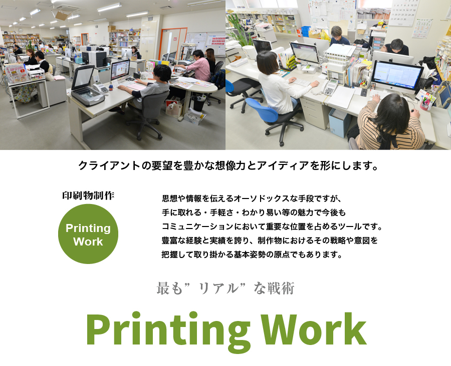クライアントの様々なご要望に幅広く柔軟に対応しながら、よりインパクトのある視覚効果を考え、印刷物の的確な訴求ポイントを探し出し、豊かな想像力とアイディアをカタチにします。