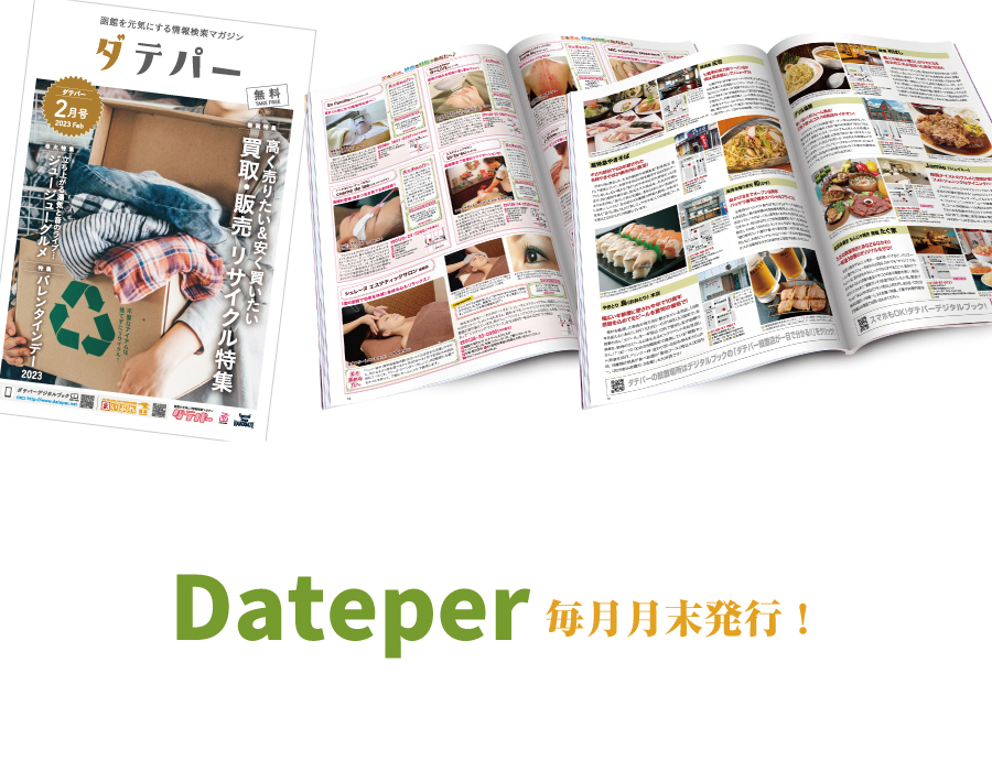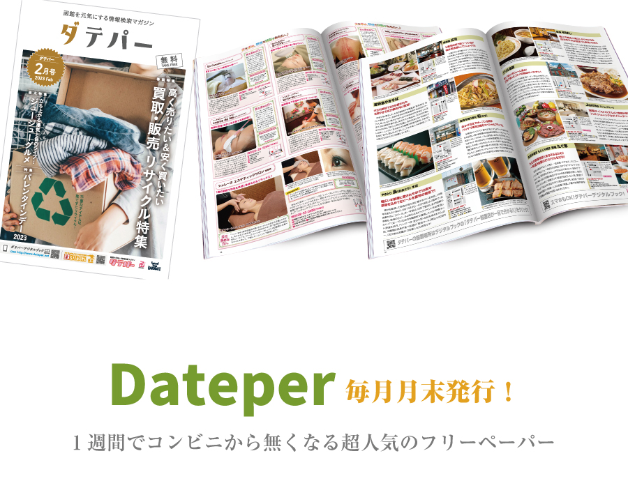 情報検索マガジン『ダテパー』は「函館を元気にする!!」をコンセプトに、地域に密着した情報を提供している、毎月月末発行の函館のフリーペーパーです。函館を中心としたエリアで、約5万部を発行している弊社発行の『ダテパー』は、現在では配布してわずか1週間で無くなってしまう程、地元の皆様に愛されるフリーペーパーに成長しました。これからも『ダテパー』は、地域をより活性化するための情報発信を、読者の皆様と一緒に目指していきます。