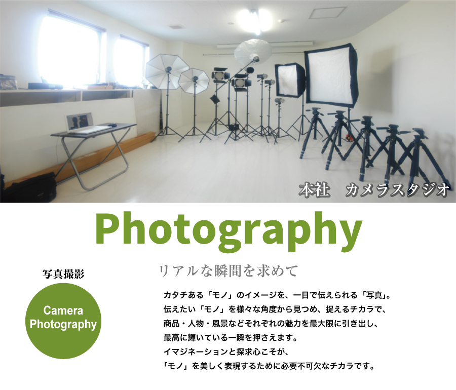 カタチある「モノ」のイメージを、一目で伝えられる「写真」。伝えたい「モノ」を様々な角度から見つめ、捉えるチカラで、商品・人物・風景などそれぞれの魅力を最大限に引き出し、最高に輝いている一瞬を押さえます。イマジネーションと探求心こそが、「モノ」を美しく表現するために必要不可欠なチカラです。